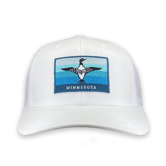 Minnesota Embroidery Flag Loon Patch on White Yupoong Classic 6 Panel Snapback Trucker Hat