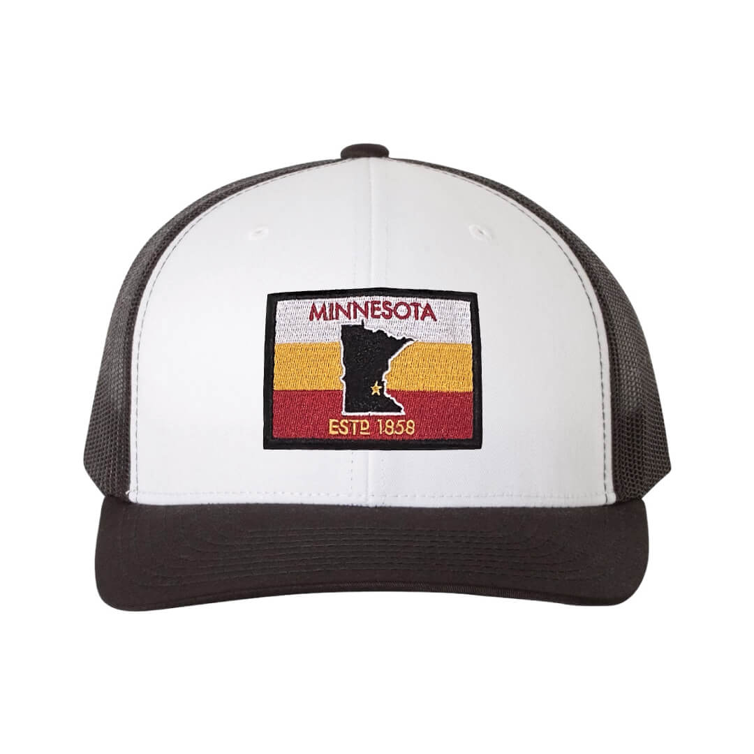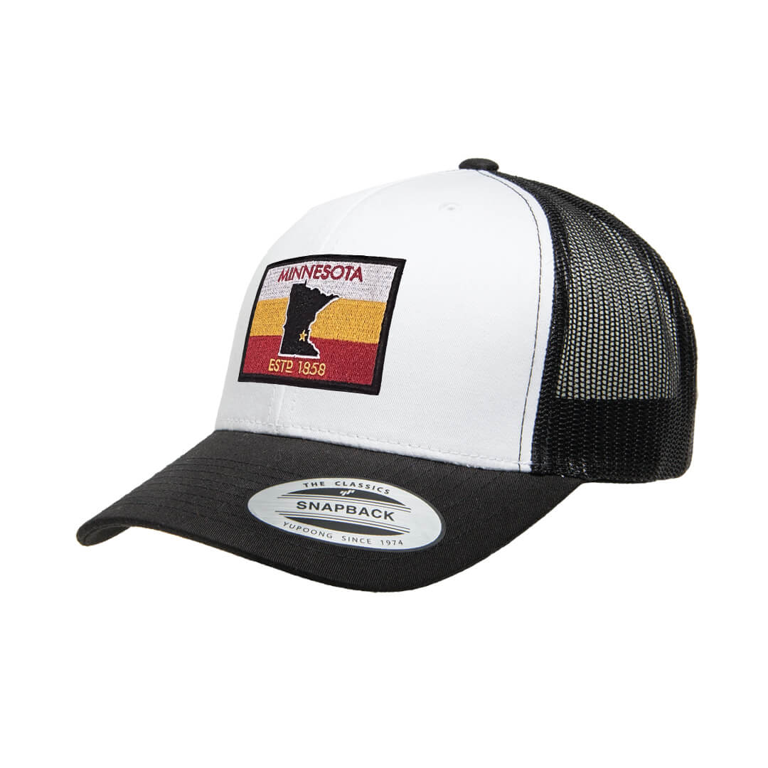 Yupoong Classic 6-Panel Trucker Hat featuring a Maroon and Gold Minnesota Est. Flag Patch.
