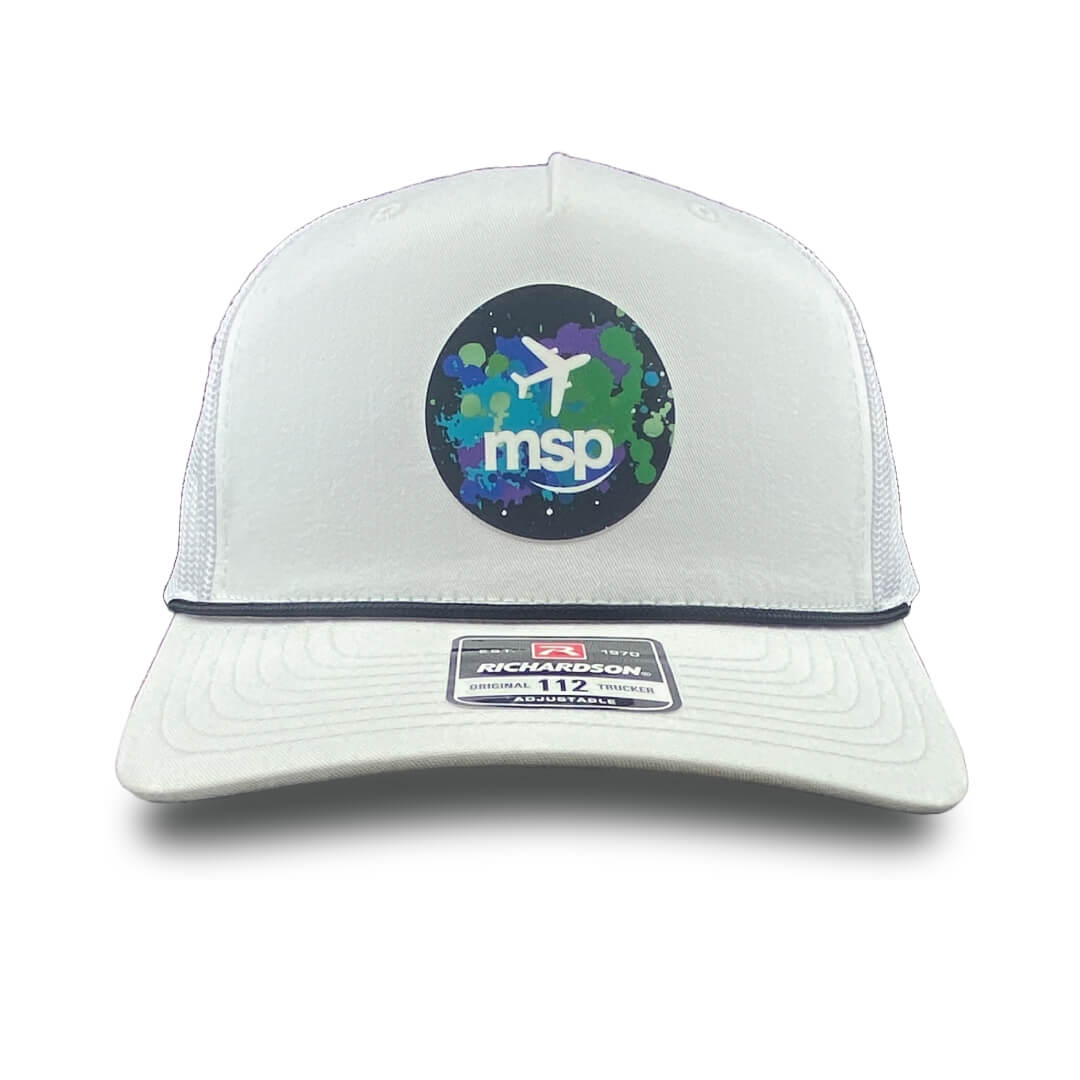 MSP White Trucker Hat with Black Rope accent featuring the Paint Splatter Airplane Silicone Patch